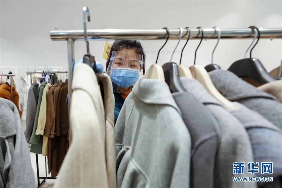 3月30日,在武漢市武商世貿(mào)廣場(chǎng),銷售員在整理貨架上的衣服。當(dāng)日,武漢市多家商場(chǎng)開門迎客。新華社記者沈伯韓攝