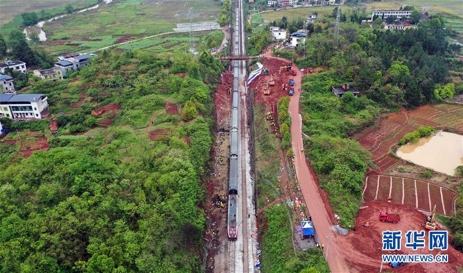 4月1日,Z201次旅客列車通過京廣鐵路郴州段脫軌事故區(qū)段(無人機(jī)照片)。新華社記者李尕攝