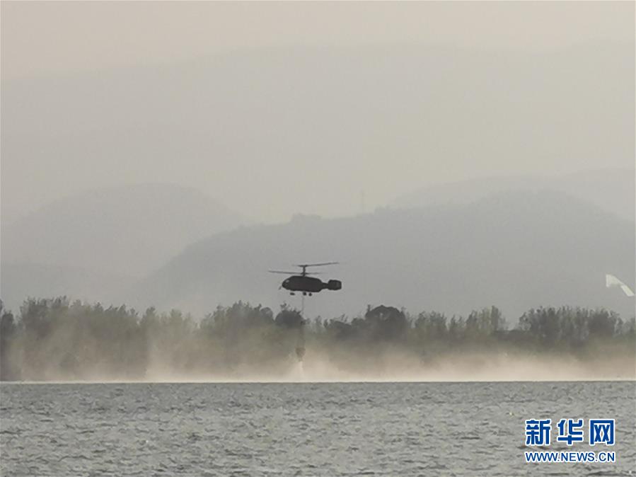 3月31日,在四川省西昌市,救火直升機從邛海取水。新華社記者惠小勇攝