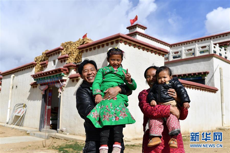 在拉薩市堆龍德慶區(qū)古榮鄉(xiāng)榮瑪高海拔生態(tài)搬遷點(diǎn),尼加(左一)和家人在家門(mén)前合影(4月2日攝)。