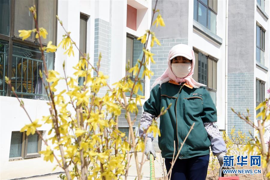 在古浪縣綠洲生態(tài)移民小城鎮(zhèn),胥存打掃小城鎮(zhèn)花園衛(wèi)生(4月7日攝)。新華社記者范培珅攝