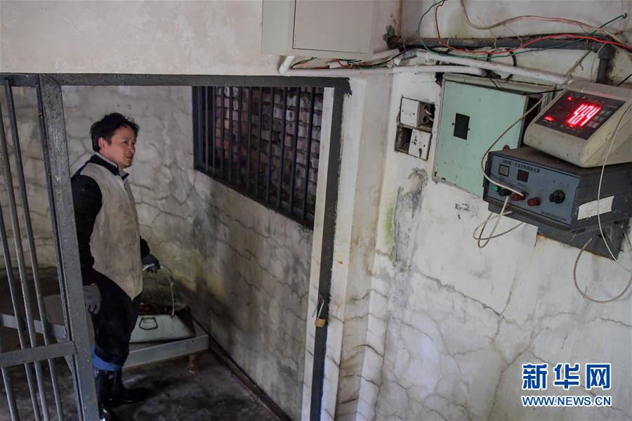 4月14日,中國(guó)大熊貓保護(hù)研究中心核桃坪基地飼養(yǎng)員周季秋在打掃完大熊貓“喜妹”的圈舍后,將大熊貓前一晚排泄的糞便稱(chēng)重并記錄。新華社記者張超群攝