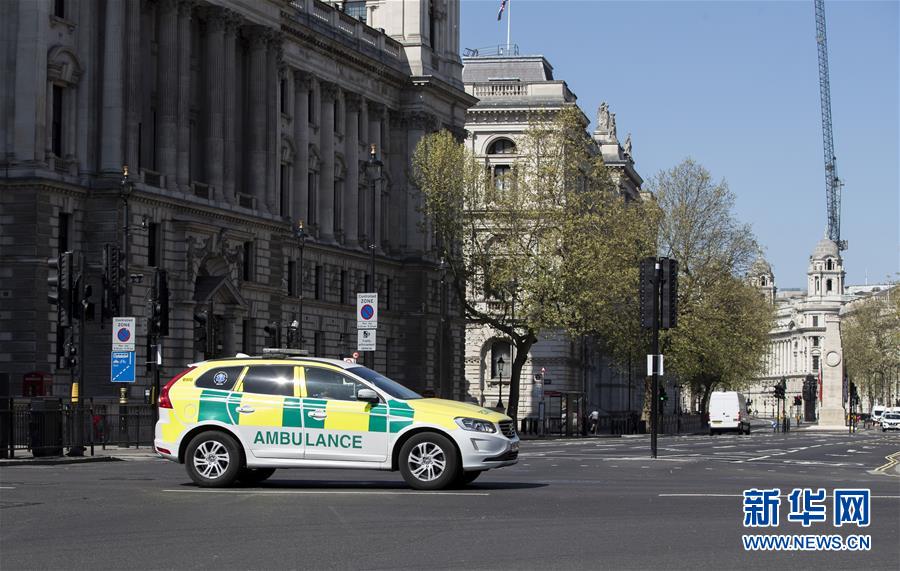 4月14日,在英國倫敦,一輛救護車從議會街前駛過。新華社記者韓巖攝