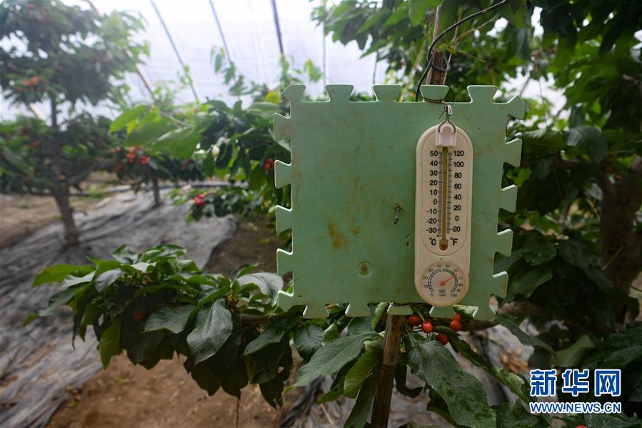 這是4月15日在特克斯礪劍鋒農(nóng)林科技有限公司赤谷新城休閑觀光農(nóng)業(yè)示范園拍攝的反季節(jié)大櫻桃大棚內(nèi)的溫濕度計。大棚采用自動控制通風(fēng)裝置,保持棚內(nèi)溫度濕度穩(wěn)定。近日,新疆伊犁哈薩克自治州特克斯縣的反季節(jié)大櫻桃陸續(xù)上市。傳統(tǒng)大田櫻桃的集中成熟期在6月底至7月初,采用溫室大棚種植櫻桃可將成熟期提前到3月底至4月初,填補了市場空檔期。特克斯礪劍鋒農(nóng)林科技有限公司目前種植反季節(jié)大櫻桃共有19棚,櫻桃每公斤售價達200元。新華社記者宋彥樺攝