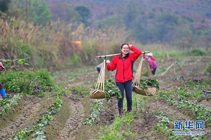 在廣西融水苗族自治縣永樂鎮(zhèn)紅薯種植基地,石秋香挑著紅薯苗,準備種植(3月14日攝)。