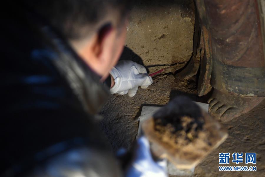 12月25日,在麥積山石窟第11窟,修復(fù)師牟常有對塑像破損處進行加固處理。新華社記者馬寧攝