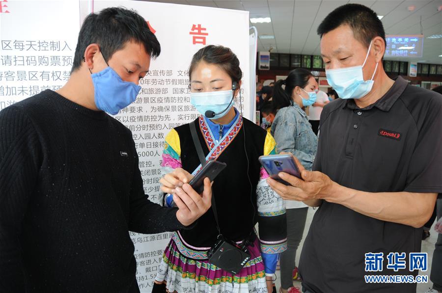 4月30日,織金洞景區(qū)工作人員(中)在給游客講解線上購票方法?!拔逡弧毙¢L假將至,位于貴州省織金縣的世界地質(zhì)公園織金洞景區(qū)迎來各地游客。據(jù)了解,該景區(qū)實行分時段預(yù)約和人數(shù)限流措施,確保游客安全有序游覽。新華社記者 李黔渝 攝