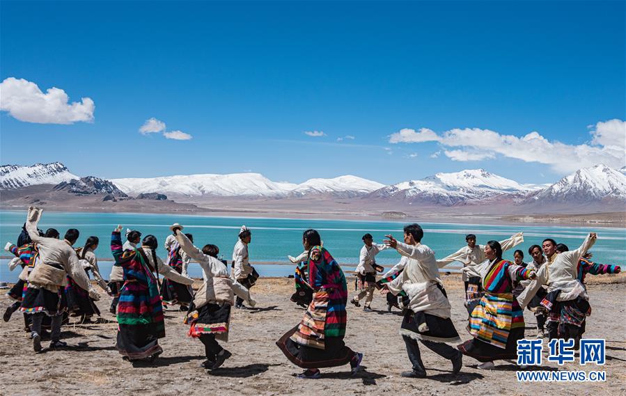 4月30日,牧民在當穹錯湖畔跳鍋莊舞。當穹錯地處西藏那曲市尼瑪縣南部,湖面海拔4475米。暮春時節(jié),湖水碧藍清亮,讓人仿佛置身仙境。新華社記者侯捷攝