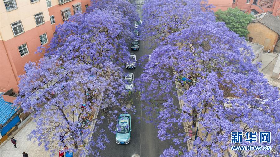 這是5月2日在昆明市教場(chǎng)中路拍攝的藍(lán)花楹(無人機(jī)照片)。近日,云南省昆明市部分街區(qū)的藍(lán)花楹競(jìng)相開放,為春城增添靚麗風(fēng)景。新華社記者藺以光攝
