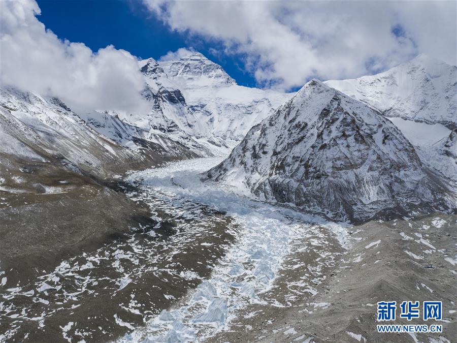 位于珠穆朗瑪峰腳下海拔5400米左右的中絨布冰川(4月30日攝,無(wú)人機(jī)照片)。位于珠穆朗瑪峰腳下海拔5400米左右的中絨布冰川,巍峨壯觀,冰塔林托起世界最高峰,讓人嘆為觀止。新華社記者普布扎西攝