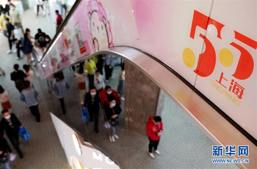 上海一家商場(chǎng)布置的“五五購(gòu)物節(jié)”標(biāo)識(shí)(5月5日攝)。5月4日晚,上海首次啟動(dòng)大規(guī)模商業(yè)促銷活動(dòng)“五五購(gòu)物節(jié)”,多家在線新經(jīng)濟(jì)企業(yè)參與,通過線上流量?jī)?yōu)勢(shì)反哺線下賣場(chǎng),實(shí)現(xiàn)電商與實(shí)體零售融合互動(dòng),激活消費(fèi)潛力、驅(qū)動(dòng)消費(fèi)復(fù)蘇。據(jù)“上海發(fā)布”的消息,截至5日14時(shí)12分,“五五購(gòu)物節(jié)”上海地區(qū)消費(fèi)支付總額已超100億元。新華社記者劉穎攝