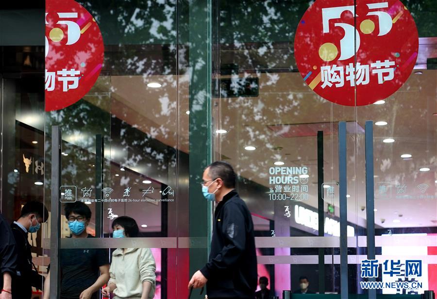 上?;春B芬患疑虉?chǎng)的“五五購(gòu)物節(jié)”標(biāo)識(shí)(5月5日攝)。5月4日晚,上海首次啟動(dòng)大規(guī)模商業(yè)促銷活動(dòng)“五五購(gòu)物節(jié)”,多家在線新經(jīng)濟(jì)企業(yè)參與,通過線上流量?jī)?yōu)勢(shì)反哺線下賣場(chǎng),實(shí)現(xiàn)電商與實(shí)體零售融合互動(dòng),激活消費(fèi)潛力、驅(qū)動(dòng)消費(fèi)復(fù)蘇。據(jù)“上海發(fā)布”的消息,截至5日14時(shí)12分,“五五購(gòu)物節(jié)”上海地區(qū)消費(fèi)支付總額已超100億元。新華社記者劉穎攝