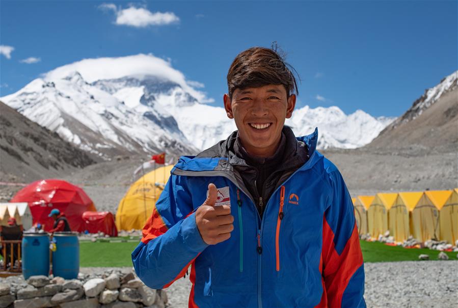 西藏圣山公司高山向?qū)赚旑D珠在珠峰大本營(yíng)(5月8日攝)。5月8日是世界微笑日。在海拔5200米的珠峰大本營(yíng),參與2020珠峰高程測(cè)量的各方人員,微笑期待本次測(cè)量活動(dòng)的圓滿成功。