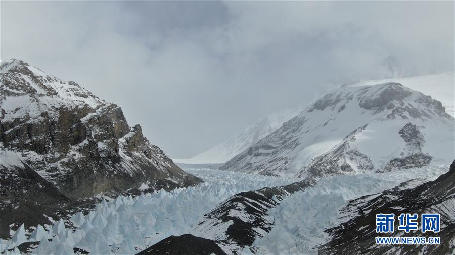 過渡營地附近的冰塔林(5月8日攝,無人機照片)。珠峰過渡營地海拔5800米,是連接前進營地和珠峰大本營的重要一站。登山愛好者從大本營徒步大約四個小時就能抵達過渡營地。此段路程亂石林立,同時也能欣賞壯美的冰川。新華社記者孫非攝