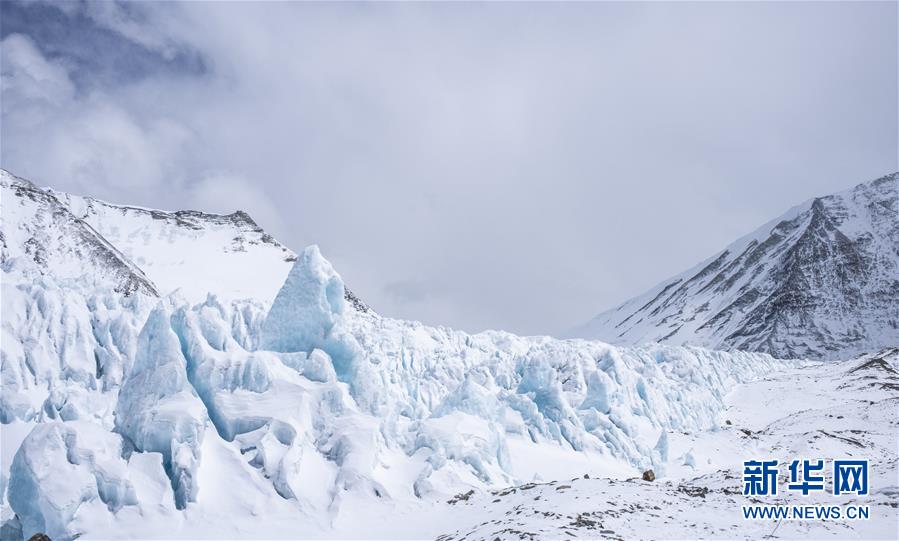 珠峰海拔5800米至海拔6500米的冰塔林(5月9日攝)。從海拔5800米的珠峰過渡營地到海拔6500米的前進(jìn)營地,冰塔林沿山谷排列,蔚為壯觀。新華社記者孫非攝
