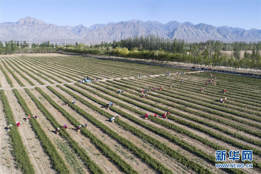 5月11日,采茶工在寧夏百瑞源賀蘭山基地采摘枸杞芽茶(無(wú)人機(jī)照片)。當(dāng)日,寧夏百瑞源賀蘭山基地枸杞芽茶全面進(jìn)入采摘季。據(jù)了解,該基地茶園面積300余畝,助力附近200多名農(nóng)民就業(yè)增收。新華社記者楊植森攝