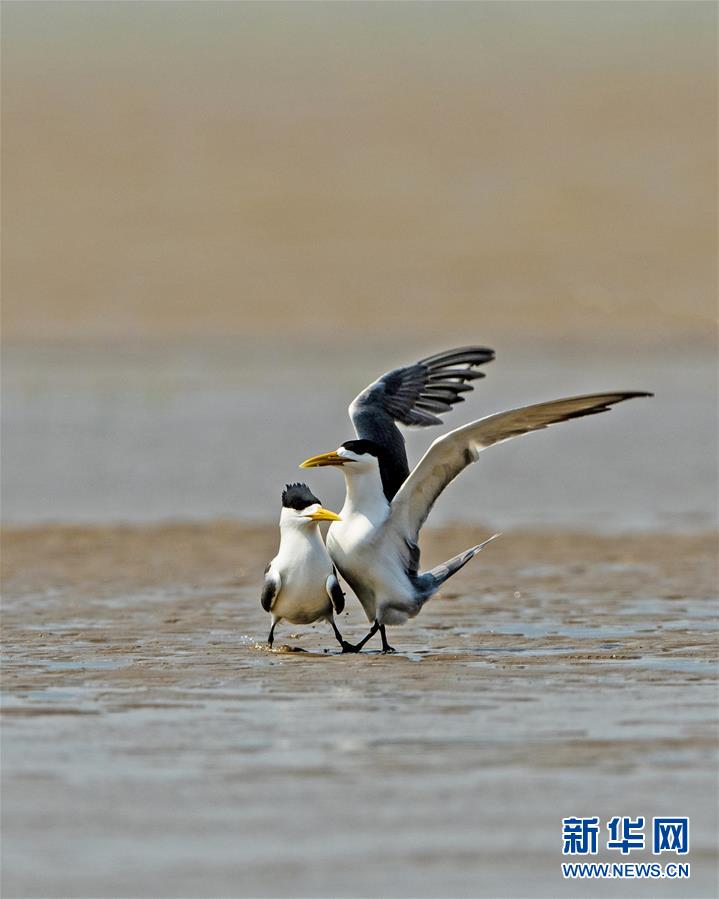 眼下正是大鳳頭燕鷗繁育的時(shí)節(jié),在福建閩江河口濕地核心區(qū)鱔魚(yú)灘的沙洲上,大鳳頭燕鷗正相互嬉戲(5月9日攝)。新華社記者梅永存攝