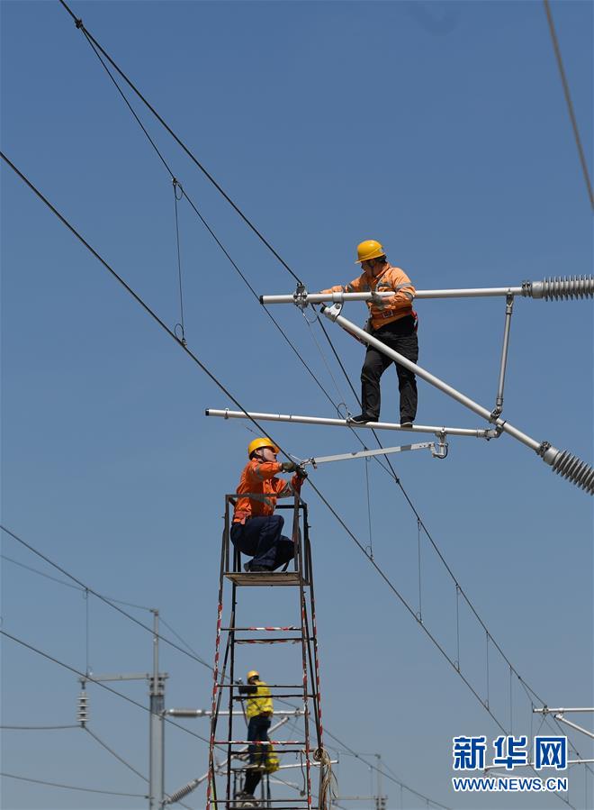5月12日,中國鐵路上海局集團公司上海高鐵維修段的技術人員在商合杭高鐵浙江湖州段調整接觸網導線。近日,商合杭高鐵合肥至湖州段聯(lián)調聯(lián)試正有條不紊進行中。中國鐵路上海局集團公司上海高鐵維修段抽調49名精兵強將,持續(xù)對管轄范圍內的高鐵線路、信號、接觸網線進行調試,為下一階段打下基礎。據了解,商合杭高鐵合湖段聯(lián)調聯(lián)試之后將轉入運行試驗階段,驗收合格并通過安全評估后,力爭6月底具備開通運營條件。新華社記者黃宗治攝