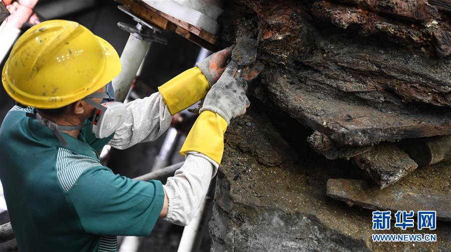 在廣東陽江海陵島,工作人員在“南海I號(hào)”發(fā)掘現(xiàn)場(chǎng)進(jìn)行清理工作(5月12日攝)。新華社記者鄧華攝