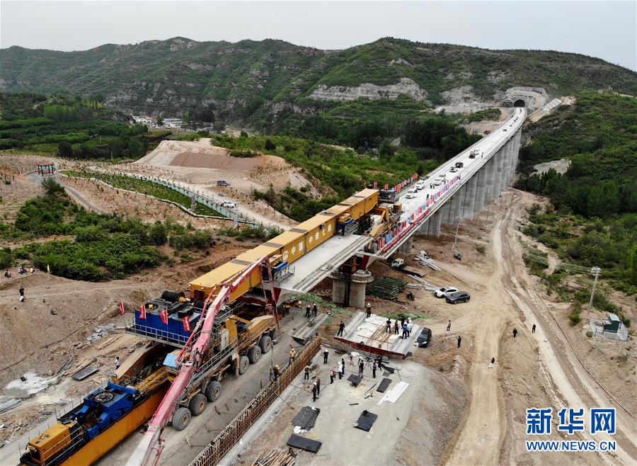 5月13日,運架一體機在位于河南焦作的施工現(xiàn)場進行架梁作業(yè)(無人機照片)。 當日,隨著最后一榀長24米、重552噸的箱梁架設就位,太焦高鐵全線橋梁架設完成。從山西太原到河南焦作的太焦高鐵是國家規(guī)劃建設的“八縱八橫”高速鐵路網(wǎng)的重要組成部分,計劃2020年底建成通車。 新華社記者李安攝