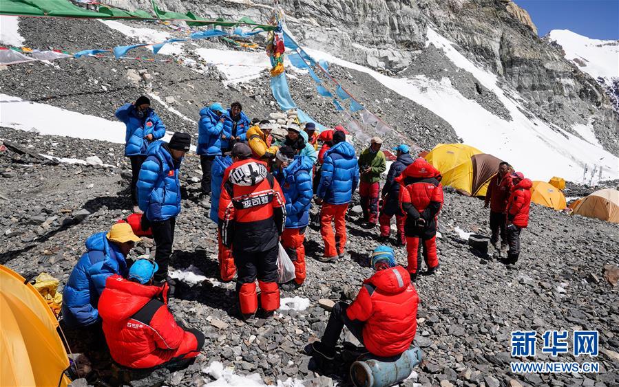 這是在海拔6500米的珠峰前進(jìn)營(yíng)地拍攝的公布2020珠峰高程測(cè)量12人沖頂隊(duì)員名單現(xiàn)場(chǎng)(5月18日攝)。新華社特約記者扎西次仁攝