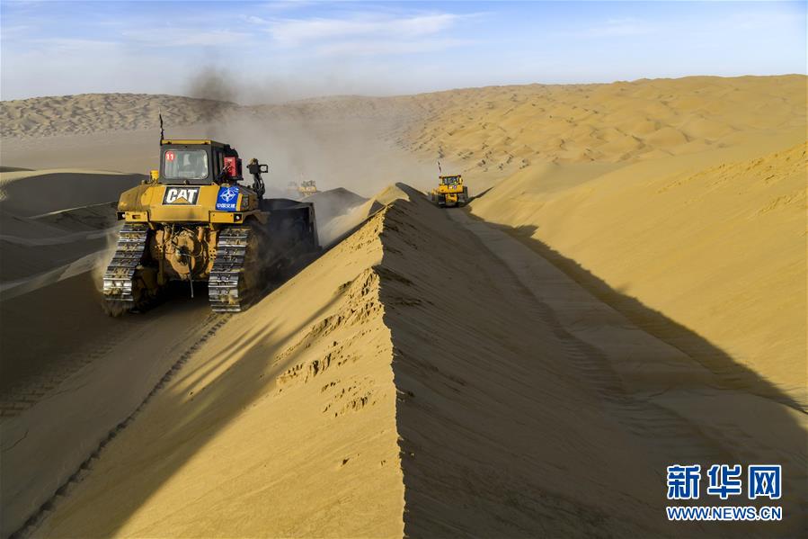 在新疆尉犁至且末沙漠公路施工現(xiàn)場(chǎng),工人駕駛大型推土機(jī)推平沙山(5月16日攝)。新華社記者胡虎虎攝
