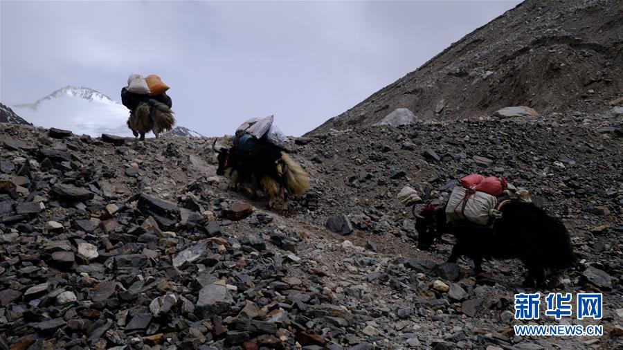 牦牛運(yùn)輸隊(duì)向海拔5800米的過渡營地運(yùn)輸物資(5月19日攝)。新華社記者晉美多吉攝