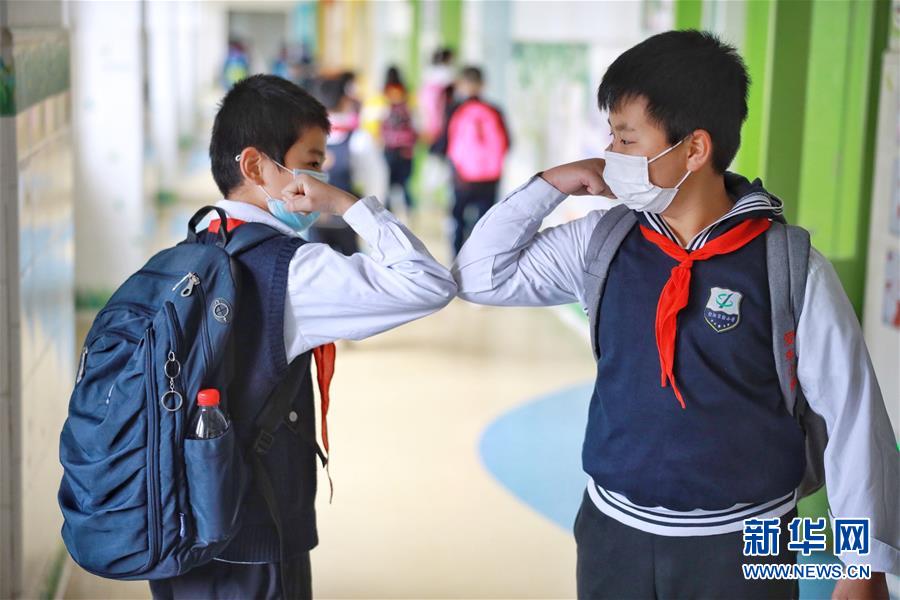 5月25日,北京市朝陽區(qū)實驗小學貴陽分校的兩個孩子用“碰肘”的方式打招呼。新華社記者劉續(xù)攝