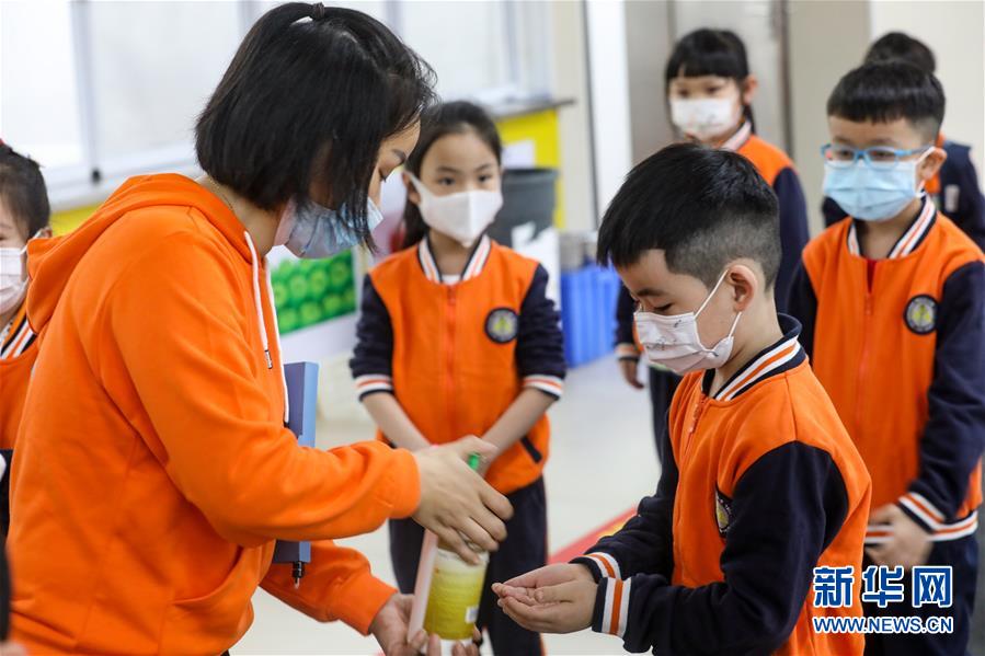 5月25日,廣州市荔灣區(qū)蔣光鼐紀念小學的老師在校門口指導返校的學生進行手部消毒。當日,廣州市各小學一至三年級學生正式開學復課。至此,廣州市中小學各年級已全部開學復課。新華社記者盧漢欣攝
