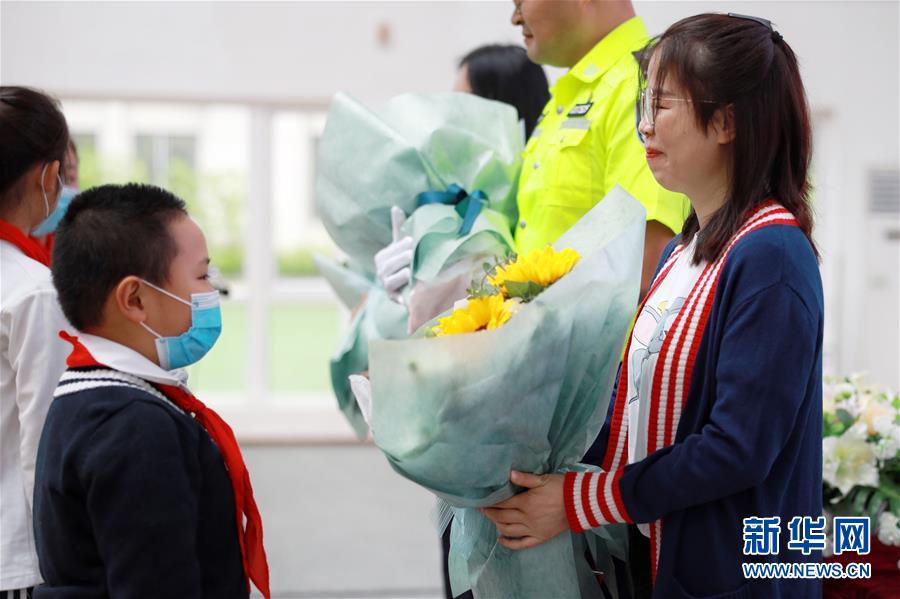 5月25日,北京市朝陽區(qū)實驗小學貴陽分校的學生在上開學第一課時,為前來講課的抗疫醫(yī)生送上鮮花。新華社記者劉續(xù)攝