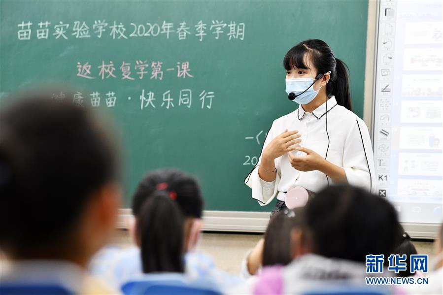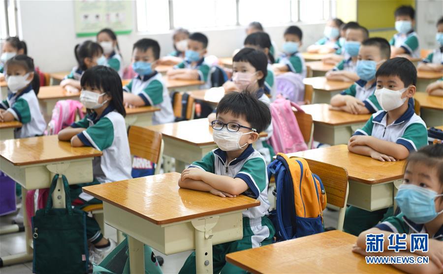 5月25日,廣州市荔灣區(qū)蔣光鼐紀念小學的老師在給學生上開學第一課。當日,廣州市各小學一至三年級學生正式開學復課。至此,廣州市中小學各年級已全部開學復課。新華社記者盧漢欣攝