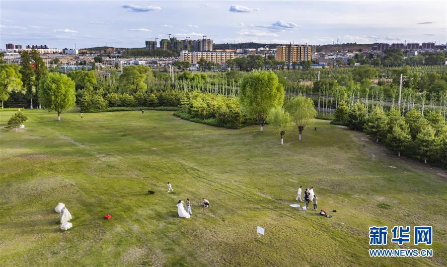 5月24日,市民在榆林市城市綠化帶拍攝婚紗照(無人機(jī)照片)。新華社記者陶明攝