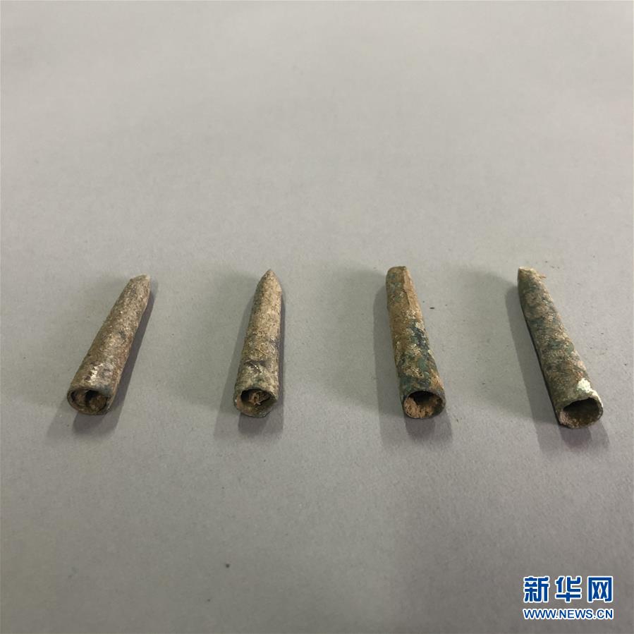黃河邊大型古墓群出土的一組青銅材質(zhì)的筆帽(5月22日攝)。新華社記者李麗靜攝