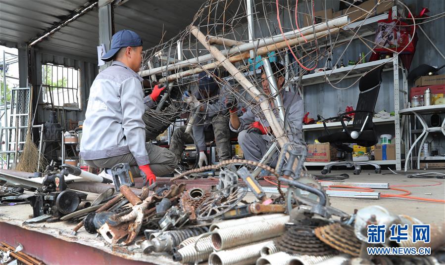 中轉服務站工棚地上堆滿分揀出來準備制作工藝品的材料(5月27日攝)。新華社記者方喆攝=