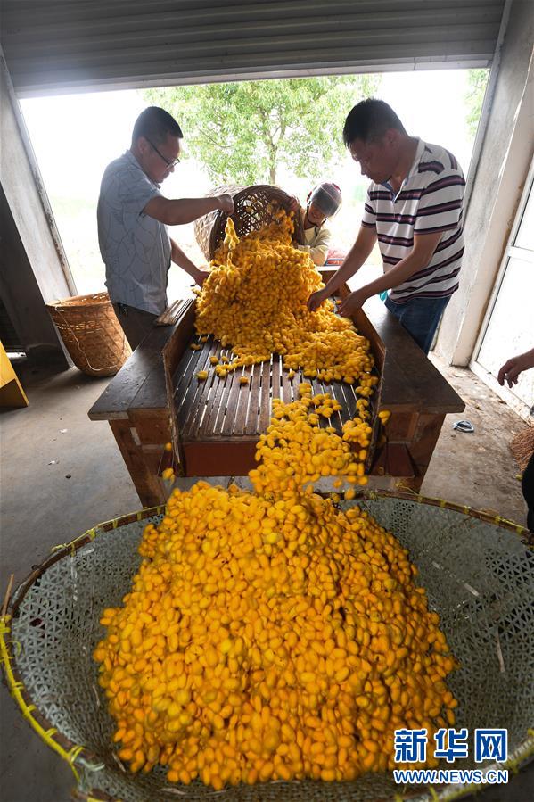 5月27日,桐鄉(xiāng)市鳳鳴街道建勝村70歲的村民宋柏明在收獲“黃金繭”。他今年在桐鄉(xiāng)興民蠶業(yè)專業(yè)合作社的指導(dǎo)下首次養(yǎng)3張黃金蠶繭種,收獲“黃金繭”近400斤,比往年同期增收1500元。近期,蠶桑之鄉(xiāng)浙江省桐鄉(xiāng)市的蠶農(nóng)們迎來了蠶繭豐收的季節(jié),其中新品種“黃金繭”的增收效果尤其明顯。據(jù)介紹,與普通蠶絲相比,色澤金黃的黃金蠶絲中葉黃素含量高,抗菌效果更好,深受市場青睞。2020年春季,浙江省桐鄉(xiāng)市共計發(fā)放黃金蠶繭種1225張,產(chǎn)量預(yù)計75噸,總產(chǎn)值近300萬元,較普通蠶繭增收約20%,成為當(dāng)?shù)剞r(nóng)業(yè)增收的亮點。浙江省桐鄉(xiāng)市是我國蠶桑的重要產(chǎn)地,“桐鄉(xiāng)蠶桑習(xí)俗”也被國務(wù)院列入第二批國家級非物質(zhì)文化遺產(chǎn)名錄。新華社記者徐昱攝