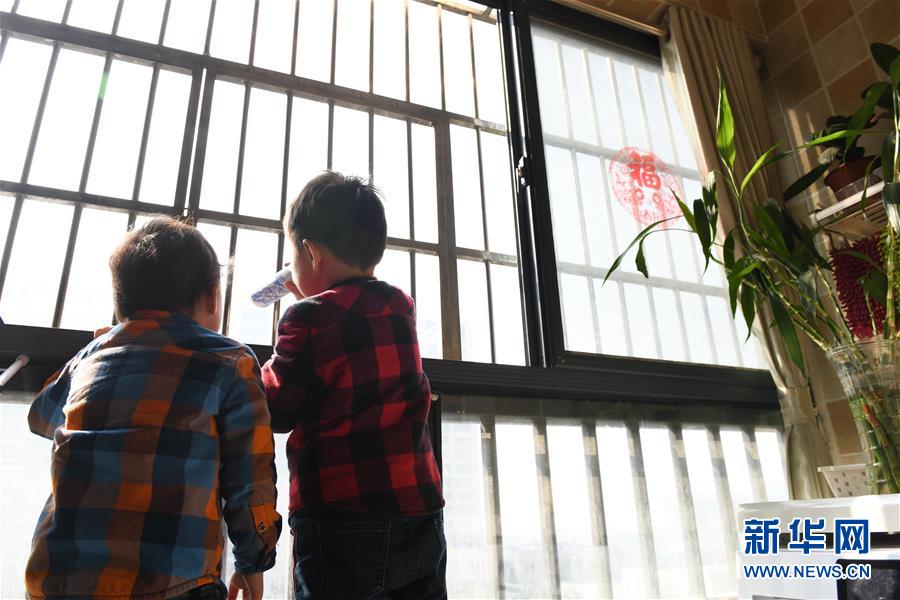 合肥第二人民醫(yī)院附近,兒子在家中陽(yáng)臺(tái)手持自制“放大鏡”,眺望在對(duì)面醫(yī)院“打病毒”的護(hù)士媽媽?zhuān)?月3日攝)。新華社記者張端攝
