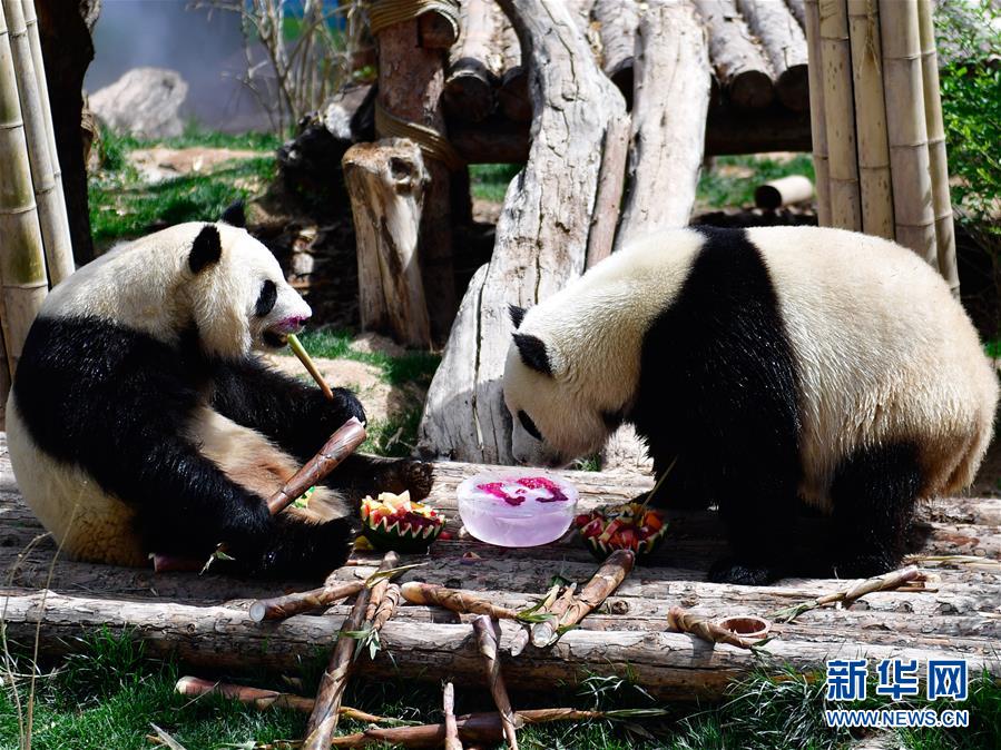 5月31日,兩只大熊貓?jiān)谙碛脙和?jié)“大餐”。新華社記者張龍攝