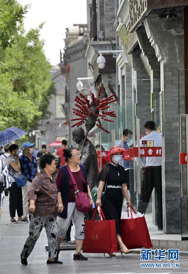 6月3日,市民及游客在前門(mén)步行街購(gòu)物觀光。近日,游人和市民紛紛來(lái)到北京市的王府井、西單、前門(mén)大街等著名商業(yè)街購(gòu)物休閑,這些老商業(yè)街開(kāi)始逐步恢復(fù)昔日的繁華。新華社記者李欣攝。