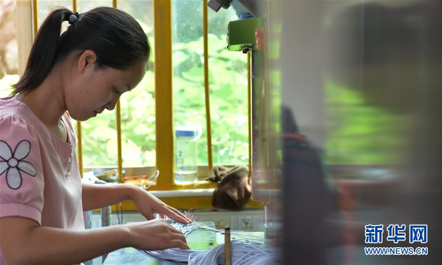 6月4日,一名女工在永州市新田縣一處易地搬遷集中安置點(diǎn)的扶貧車間里加工電器零部件。新華社記者趙眾志攝。
