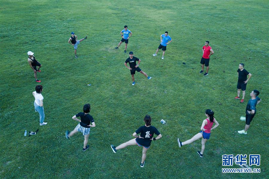 6月11日,海口一家跑團(tuán)負(fù)責(zé)人張雪怡(右)在夜跑結(jié)束后帶領(lǐng)跑團(tuán)成員做拉伸運(yùn)動(dòng)。近年來,夜跑成為越來越多都市人熱衷的健身方式之一。在海南???,每當(dāng)夜幕降臨,“夜跑族”來到??谌f綠園、世紀(jì)公園等夜跑場(chǎng)所跑步,用一身酣暢淋漓的汗水?dāng)[脫白天工作中的壓力,享受跑步帶來的歡愉。新華社記者 蒲曉旭 攝