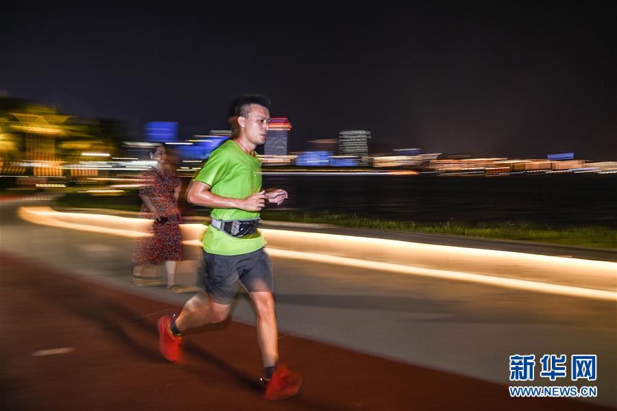 一位市民在??谑兰o(jì)公園濱海步道夜跑(5月15日拍攝)。近年來,夜跑成為越來越多都市人熱衷的健身方式之一。在海南??冢慨?dāng)夜幕降臨,“夜跑族”來到??谌f綠園、世紀(jì)公園等夜跑場(chǎng)所跑步,用一身酣暢淋漓的汗水?dāng)[脫白天工作中的壓力,享受跑步帶來的歡愉。新華社記者 蒲曉旭 攝