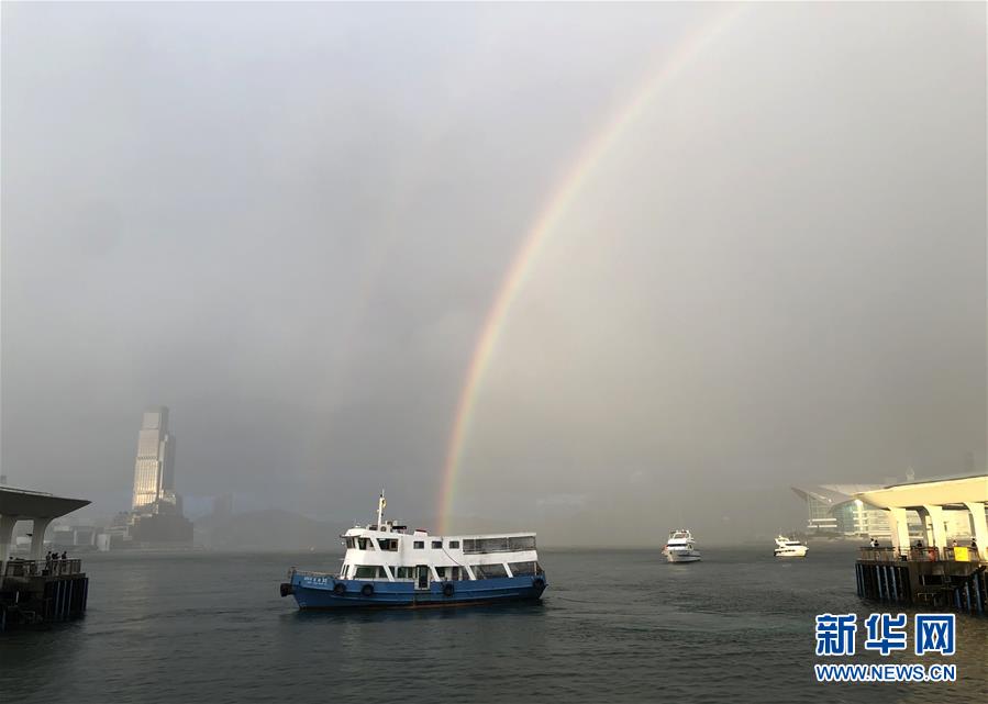 香港維多利亞港上空出現彩虹(6月16日攝)。6月16日傍晚,雨后的香港維多利亞港上空出現彩虹,美麗景色吸引市民駐足拍照。新華社記者 李鋼 攝