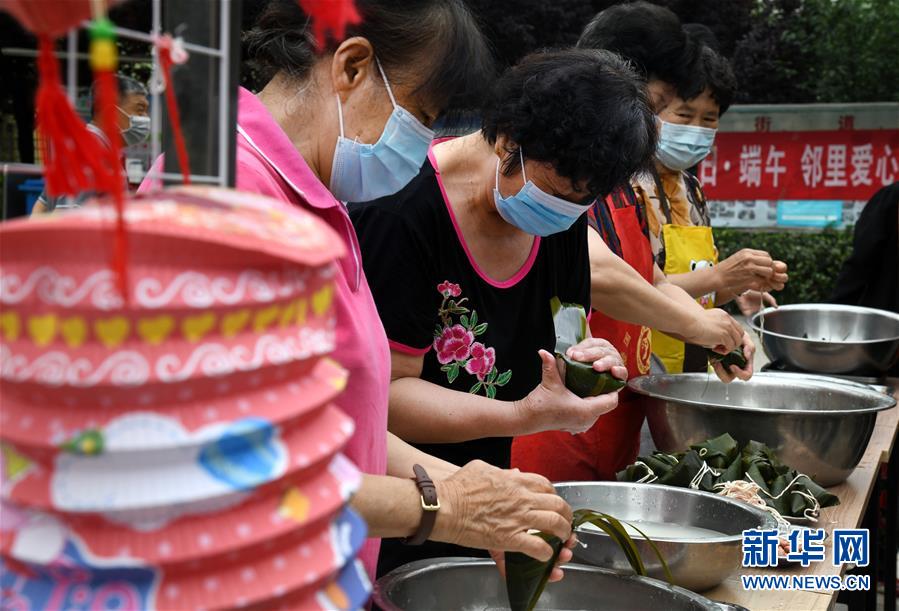 6月17日,水清溝街道居民在社區(qū)廣場(chǎng)上包粽子。當(dāng)日,青島市北區(qū)水清溝街道開展迎端午鄰里愛心傳遞進(jìn)網(wǎng)格活動(dòng),居民通過包粽子、吃粽子、網(wǎng)上端午傳統(tǒng)文化課等形式傳遞鄰里愛心,傳承民俗文化。新華社記者 李紫恒 攝
