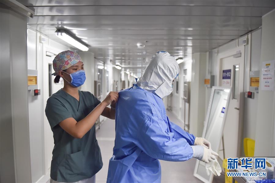 6月19日,在北京地壇醫(yī)院隔離病房外,一名護士在幫同事穿防護服。新華社記者彭子洋攝
