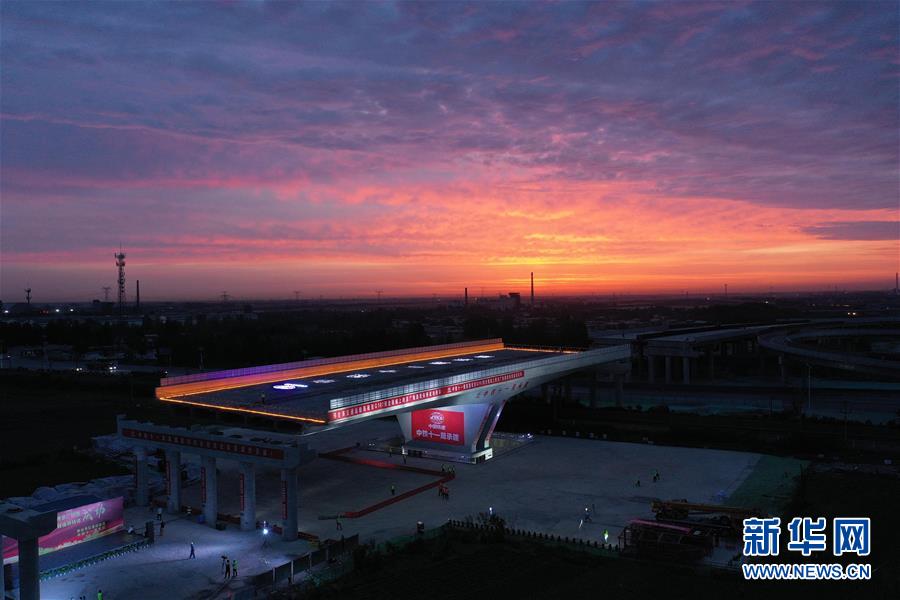 G107河北邢臺段繞城上跨京廣鐵路轉體橋實現(xiàn)成功轉體(6月16日無人機照片)。6月16日凌晨,由中鐵十一局承建的G107河北邢臺段繞城上跨京廣鐵路轉體橋成功完成歷時60分鐘的空中轉體。這座單墩雙肢結構轉體橋,轉體段長100米、寬34.5米,梁體總重達14200噸。新華社記者朱旭東攝