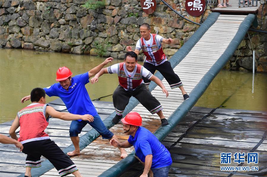 在廣西融水雙龍溝森林旅游度假區(qū)夢(mèng)嗚苗寨,幾位搬遷戶協(xié)助游客挑戰(zhàn)“搖擺橋”(6月21日攝)。近年來,融水打造原生態(tài)苗族文化體驗(yàn)園——夢(mèng)嗚苗寨,讓搬遷進(jìn)城的貧困戶住進(jìn)復(fù)原建設(shè)的老房子。景區(qū)提供綠化保潔、游樂設(shè)施管理、民族歌舞表演等工作崗位,多渠道增加貧困戶收入。