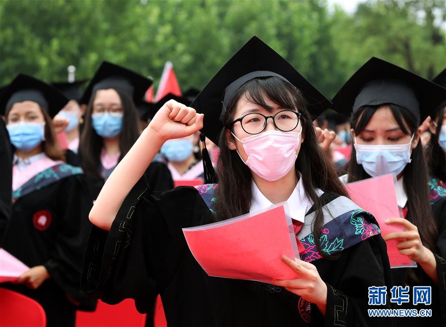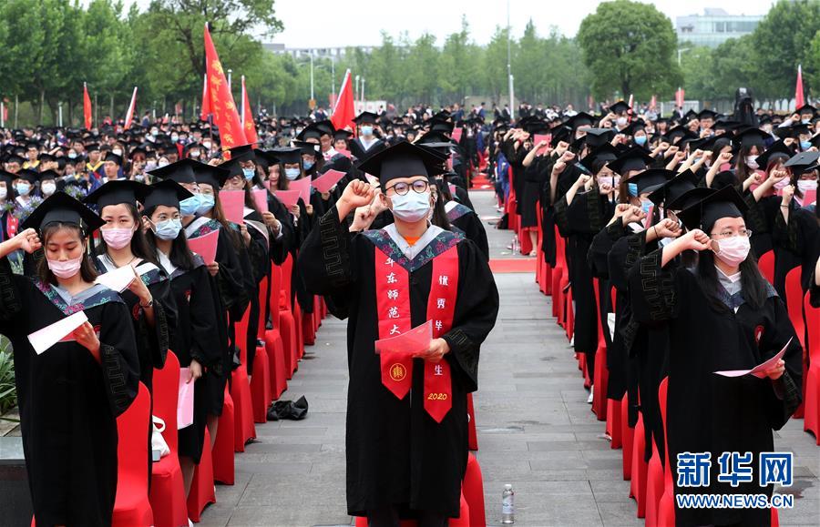 6月23日,在華東師范大學(xué)閔行校區(qū)的畢業(yè)典禮上,師范專業(yè)的畢業(yè)生舉行宣誓儀式。當(dāng)日,華東師范大學(xué)舉行2020屆畢業(yè)典禮。由于疫情防控需要,今年的典禮在兩個(gè)校區(qū)分別舉辦,并全程在線直播。約7700名華東師范大學(xué)2020屆畢業(yè)生通過現(xiàn)場(chǎng)或“云端”的方式參加畢業(yè)典禮。新華社記者劉穎攝