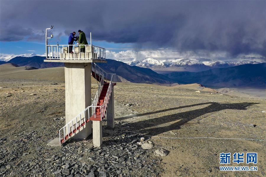 在中國科學(xué)院新疆天文臺慕士塔格觀測站,馮國杰和助理觀測員在戶外工作(6月15日攝,無人機(jī)照片)。新華社記者胡虎虎攝