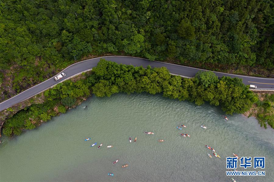 水上運(yùn)動(dòng)愛好者在杭州市富陽區(qū)湖源鄉(xiāng)的壺源溪上體驗(yàn)槳板運(yùn)動(dòng)的樂趣(6月28日攝,無人機(jī)照片)。近期,浙江省杭州市富陽區(qū)場口鎮(zhèn)、常安鎮(zhèn)和湖源鄉(xiāng)組團(tuán)開啟了一場夏季“綠水青山嘉年華”。這幾個(gè)壺源溪流域鄉(xiāng)鎮(zhèn)整合生態(tài)旅游資源,組團(tuán)開發(fā)山村旅游項(xiàng)目,游客可以參與壺源溪水上游樂、露營永安山頂、特色農(nóng)產(chǎn)品集市和瓜果節(jié)等特色活動(dòng)。新華社記者徐昱攝