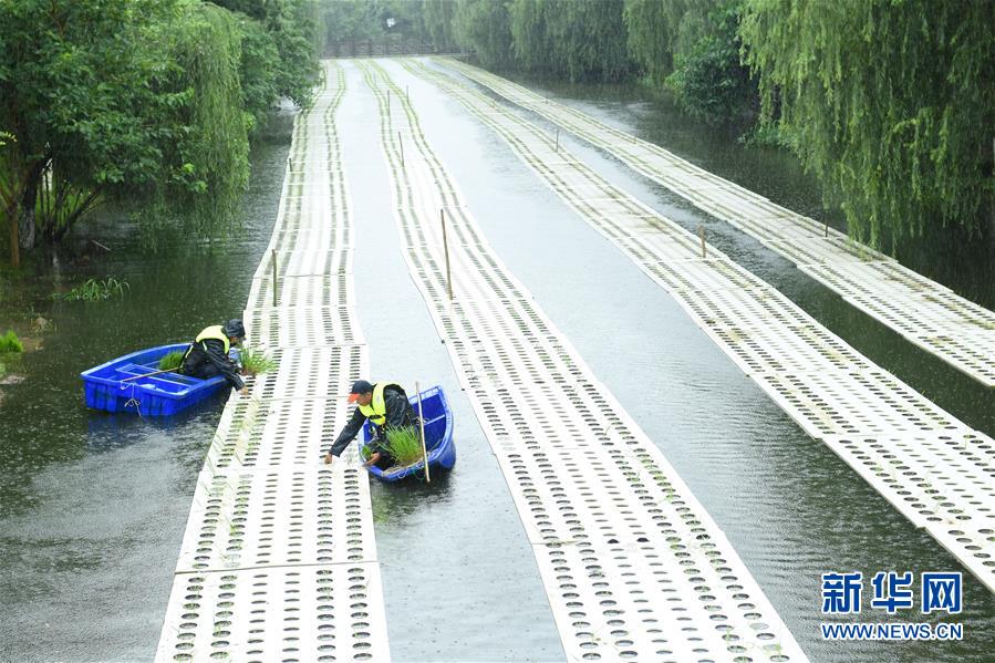 6月29日,工作人員在吳興區(qū)湖東街道的“水上稻田”插秧。今年以來,浙江湖州吳興區(qū)湖東街道開始在轄區(qū)河道大規(guī)模推廣“水上稻田”新型農(nóng)業(yè)項(xiàng)目,利用浮島進(jìn)行特種水稻種植,既能凈化水體,又能產(chǎn)出生態(tài)稻谷。“水上稻田”預(yù)計(jì)在11月實(shí)現(xiàn)收割。新華社記者翁忻旸攝